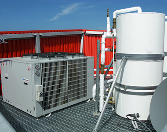 Hobsonville Point Secondary School opened a year later in 2014. Aecom specified; two 1000L duplex stainless steel insert cylinders (for outdoor use) and one Performance Plus 7GD60-3 heat pump. Installed on top of the school's roof by local firm Hanlon Plumbing, the tanks are maintained up to 60°C. Trigg comments, "With such large tanks, an energy efficient heating solution is more important than ever to reduce wasted energy and keep power bills down to a minimum. The heat pump extracts heat energy out of the air and puts it into the water. This means that on average, the running costs for the heat pumps should be two thirds of those of an alternative heat source."